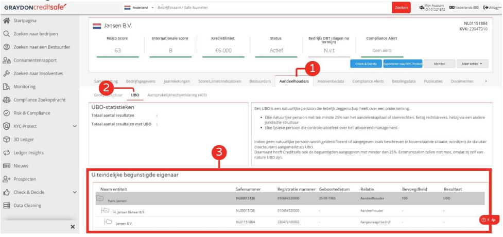 Het opzoeken van de UBO Wanneer u heeft ingelogd, uw zoekopdracht heeft uitgevoerd, de de juiste onderneming heeft geïdentificeerd en geselecteerd kunt u in het Kredietrapport via het tabblad Aandeelhouders (1) en subtabblad UBO (2) de Uiteindelijke begunstide eigenaar (3) van de onderneming bekijken, zoals weergegeven in afbeelding