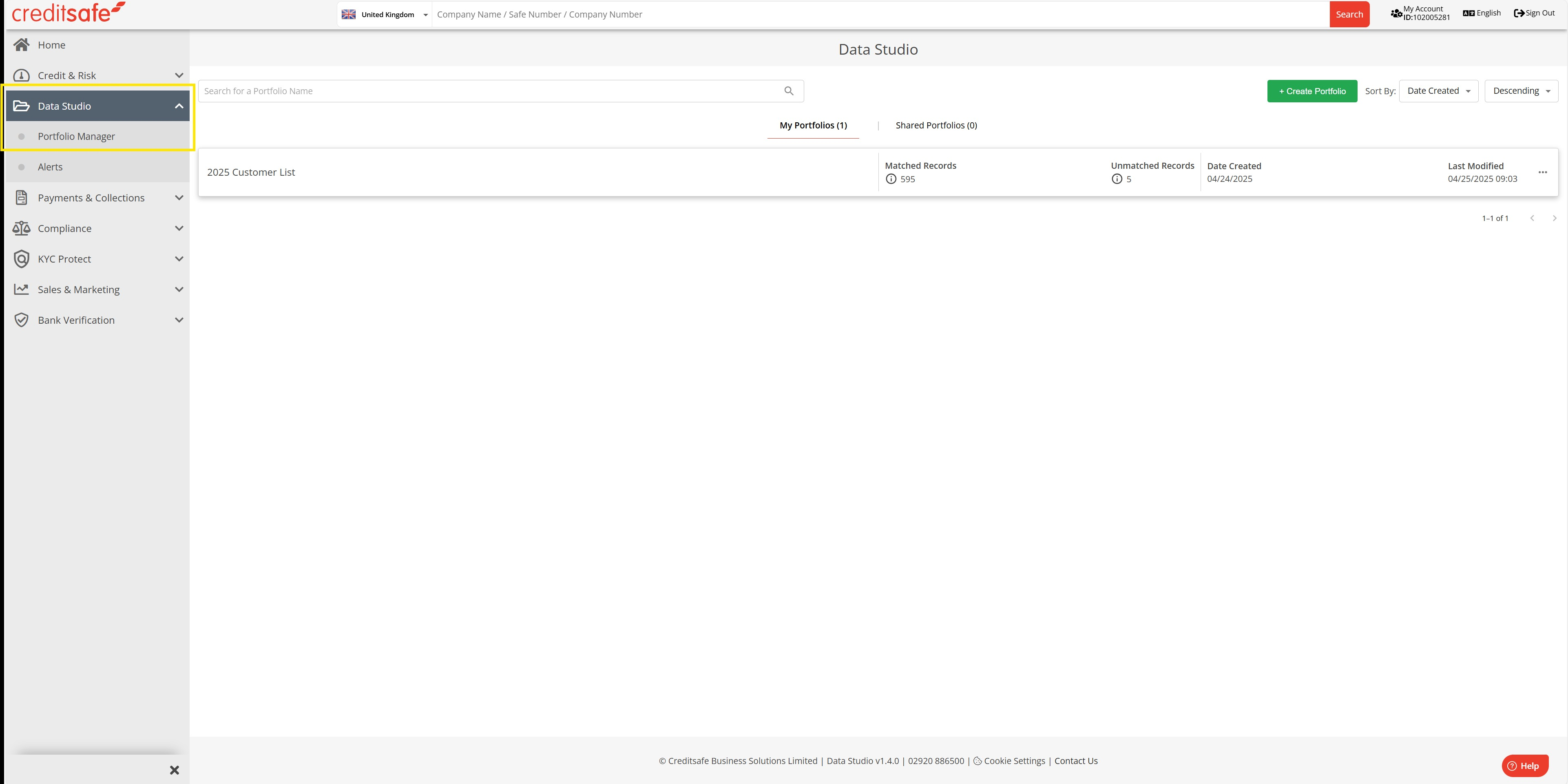 Portfolio's zijn toegankelijk via het menu aan de linkerkant door te klikken op Data Studio > Portfolio Manager. Zodra u hierop klikt, wordt u dir ect naar uw portfoliolijst geleid.