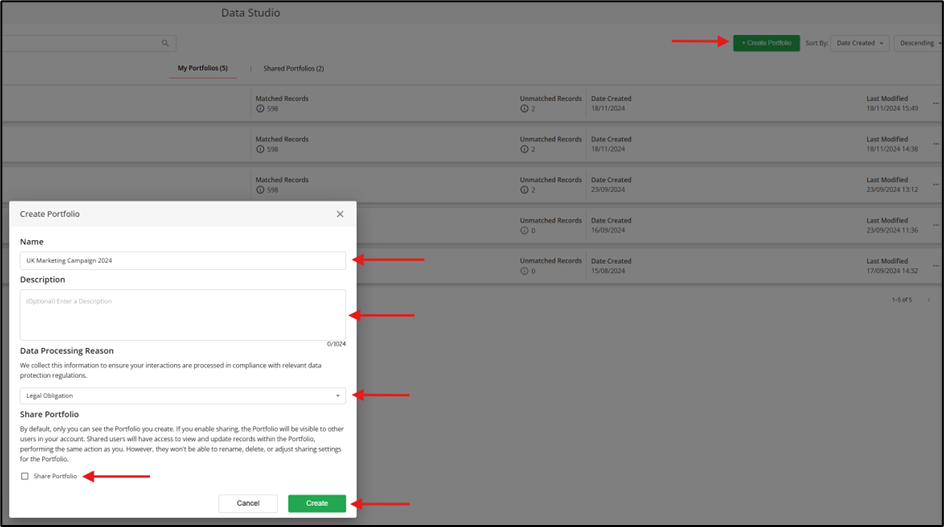 Om een nieuw portfolio aan te maken, klik op de knop “+ Portfolio maken” rechtsboven op de Portfolio-lijstpagina. Er verschijnt een pop-upvenster waarin u een naam voor het portfolio kunt invoeren. U moet ook een reden voor gegevensverwerking opgeven en u kunt aangeven of u het portfolio wilt delen met andere personen binnen uw account.