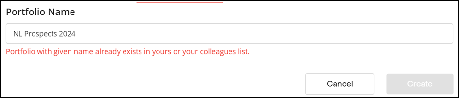 De portfolionaam moet uniek zijn. Als u een naam kiest die al bestaat, krijgt u een foutmelding te zien zoals hieronder weergegeven