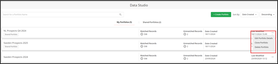 Om een bestaande portfolio te hernoemen of de beschrijving bij te werken, klikt u op het menu met drie puntjes rechts van het aantal ‘Niet-overeenkomende records’ en selecteert u de optie ‘Portfolio-details bewerken’.