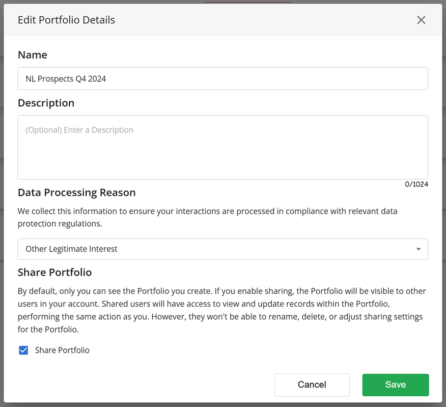Wanneer u op ‘Portfolio-details bewerken’ klikt, verschijnt er een nieuw dialoogvenster waarin u de portfolio kunt hernoemen, de beschrijving kunt aanpassen, de reden voor gegevensverwerking kunt bijwerken of de portfolio kunt delen.