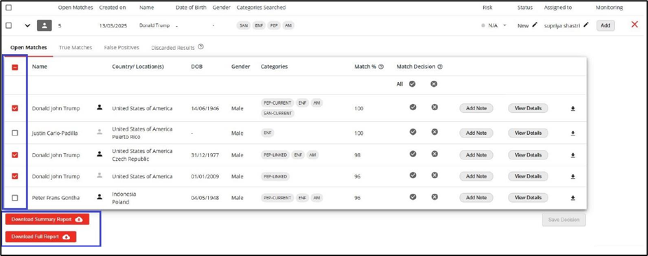 Screeningrapporten zijn van groot belang voor het naleven van regelgeving, bieden een duidelijke audittrail en ondersteunen je bij het uitvoeren van due diligence. Om je screenings te documenteren en te voldoen aan de regelgeving, kun je een rapport downloaden van de uitgevoerde zoekopdracht en de bijbehorende resultaten. Het rapport wordt gegenereerd als een PDF-bestand en bevat details over de zoekcriteria, samen met een overzicht van alle zoekresultaten. Deze resultaten zijn ingedeeld als open hits, daadwerkelijke treffers en fout-positieven.