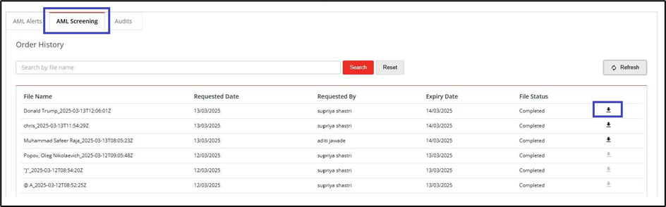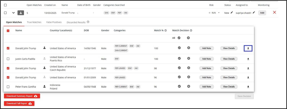 Wil je een gedetailleerd rapport downloaden met alle informatie over een treffer (bron, AML-categorieën, enzovoort)? Klik dan op het downloadicoon aan het einde van het betreffende zoekresultaat.