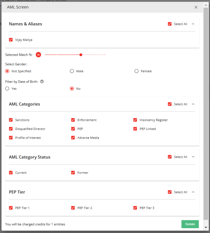 Op het tabblad Individuen/Belangrijke Partijen/UBO’s is er een nieuwe optie “Filteren op geboortedatum” beschikbaar (standaard staat deze uit). Wanneer je deze inschakelt, worden alleen de matches getoond waarbij de geboortedatum binnen ±1 jaar van de ingevoerde geboortedatum valt. Hits waarbij geen geboortedatum bekend is of die buiten deze periode vallen, worden onderdrukt.