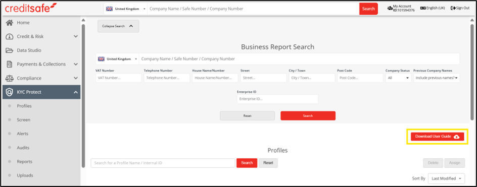 De gebruikershandleiding voor KYC Protect kunt u eenvoudig downloaden via het Creditsafe-platform. U vindt deze handleiding door naar het KYC Protect-product te gaan en vervolgens op de rode knop ‘Download Gebruikershandleiding’ te klikken. De handleiding is beschikbaar in PDF-formaat.