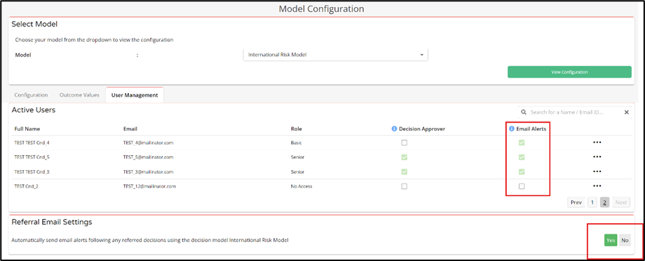 Als de gebruikersinstelling bij ‘Referral Email Settings’ op ‘Ja’ staat en er in de sectie ‘Actieve Gebruikers’ ten minste één gebruiker is waarbij de e-mailmeldingen aan staan (op ‘Ja’), dan wordt er automatisch een e-mailmelding verstuurd iedere keer dat een beslissing wordt doorgestuurd. De e-mail wordt verzonden naar de lijst met ontvangers die in de sectie ‘Actieve Gebruikers’ is ingesteld.