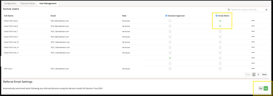 Als de gebruikersinstelling in de sectie ‘Verwijzingsmailinstellingen’ uitgeschakeld is en minimaal één gebruiker in de sectie ‘Actieve gebruikers’ heeft ‘E-mail Alerts’ aangezet (op “Ja”), wordt er geen automatische e-mail verstuurd wanneer een beslissing wordt doorverwezen.