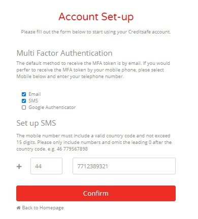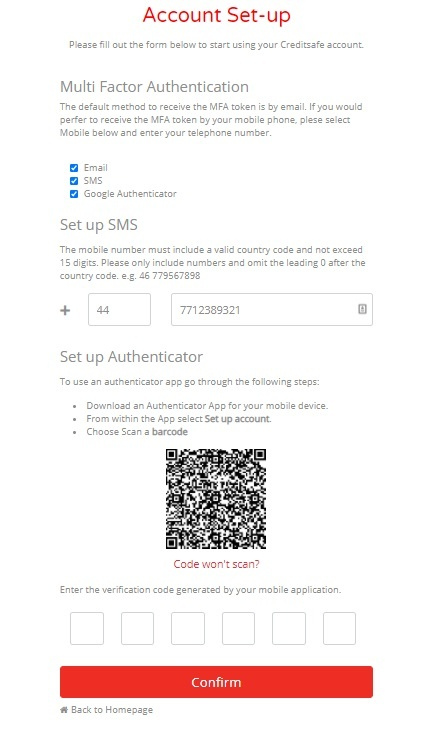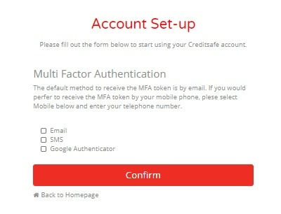 Creditsafe will offer you multiple MFA Options when we are activating (setting up) your account (Identity) with us, these include: