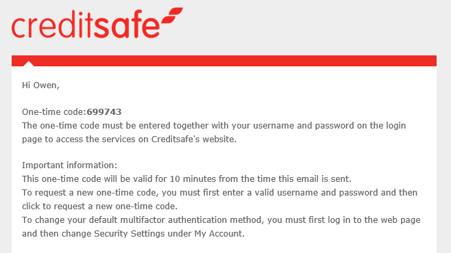If E-mail is selected it will mean you will be set-up to receive the 6 digit verification code via the e-mail address you use to log into Creditsafe.